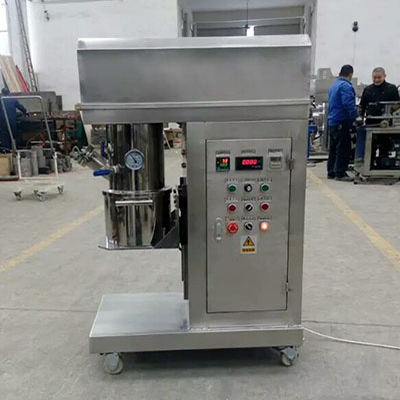 5L雙行星混合攪拌機有高速、低速、活動刮板作攪拌、剪切、刮壁、溶解用。低速運轉的攪拌錨使物料在密閉容器內上下翻動、剪切和混合,高速運轉的齒形分散盤與混合的物料產生強烈的碰擊和剪切,隨著攪拌錨的旋轉,行星架上的活動刮刀隨著旋轉,把釜體上的物料完全刮掉,使聚集物完全、徹底地達到混合、分散、溶解的要求。在其高低速的不同作用下,使物料能夠達到均勻的混合和分散。